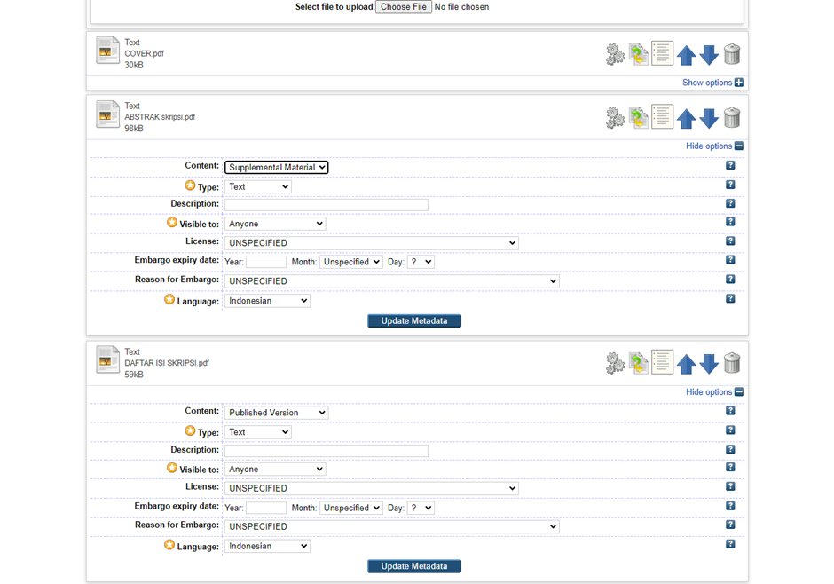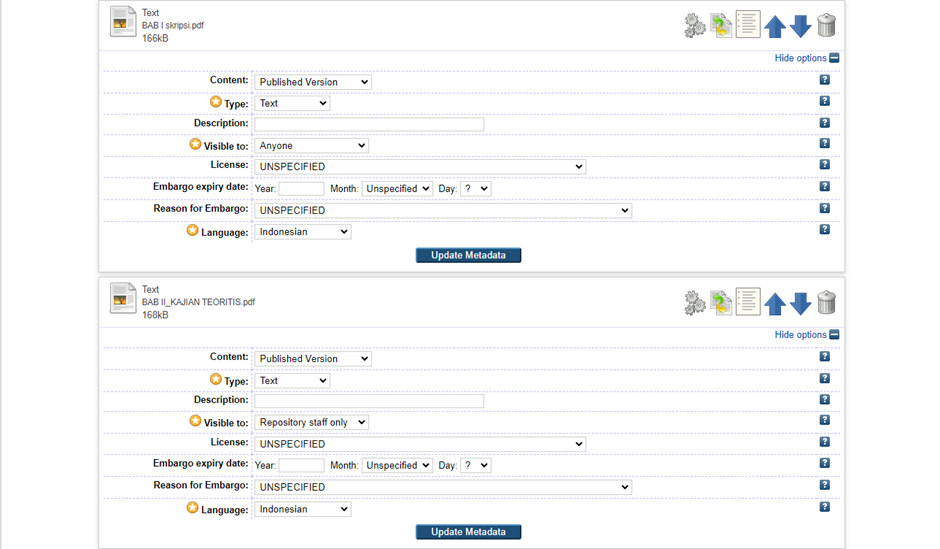 - Visible to, dari Cover – Bab 1 Menggunakan Anyone Namun Untuk Bab 2 – Daftar pustaka Menggunakan Repository Staff Olny