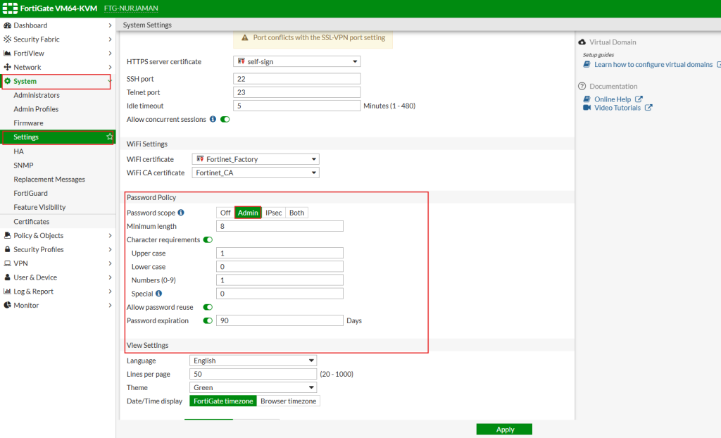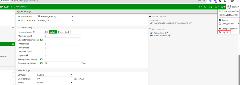 pertama masuk ke menu System lamu klick Seting cari Password policy pada Password scope pilih Admin lalu sesuaikan dengan contoh berikut untuk melakukan percobaan configurasi